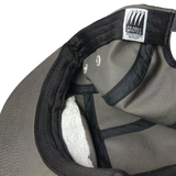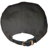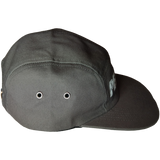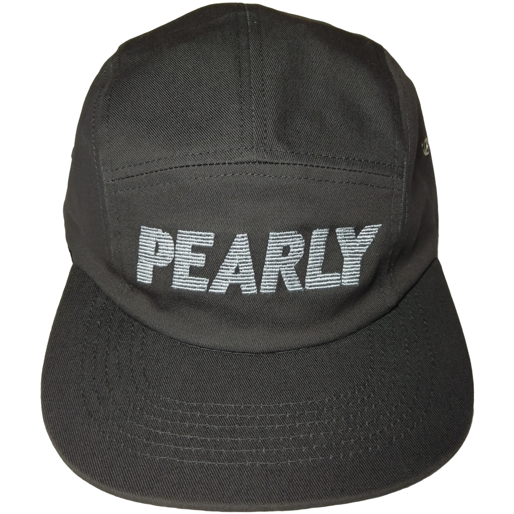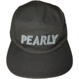 A classic 5-panel cap in dark grey, with an embroidered Pearly logo & leather strap.
