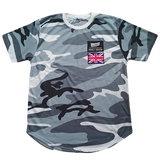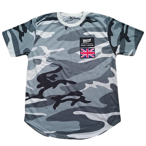 The grey camo pattern contrasted by the brand logo and union jack gives an interesting pseudo-military look combined with the casual look of a curved hem t-shirt.